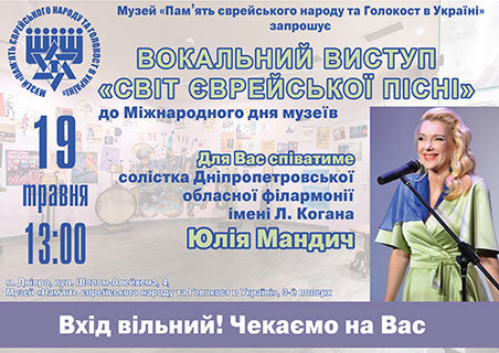 Дорогие друзья! Музей «Память еврейского народа и Холокост в Украине» приглашает Вас на празднование Международного дня музеев. 19 мая в 13:00 состоится вокальный выступление «Мир еврейской песни». Для Вас будет петь солистка Днепропетровской областной филармонии имени Л. Когана Юлия Мандич!