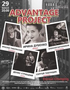 Advantage project - это объединение людей, души которых всегда находятся в творческом полёте, наполнены музыкой и жизнелюбием. В этом и есть главное преимущество - когда музыка сводит близких по духу и позволяет сотворить нечто такое, что заставляет сердца биться быстрее. Музыканты коллектива за несколько лет успели сделать немало для украинской джазовой сцены как отдельные творческие личности, выступая со многими джазовыми составами Украины и не только.Предыдущий опыт, необъятное чувство прекрасного и любовь к музыке дали рождение новому проекту, идея которого проста - одна голова хорошо, а две - ещё джазовее!))) Ирина Дубенко - джазовая вокалистка, композитор, автор текстов. Активно развивающаяся творческая единица и сессионный музыкант. За годы обучения в Харьковской консерватории работала в таких проектах, как: Forever young jazz, Jazz road, Jazz by four, Pavel Rodenko quintet, Student jazz club, а также являлась солисткой Харьковского Биг Бенда ХНУИ; также неоднократно выступала с В.Лосевым, Д.Морозом, Д.Бондаревым, Е. Чупахиным и т.д. Была участником международной программы “Cho jazz 2014”,где удалось поработать с такими известными музыкантами, как Анастасия Литвинюк и Игорь Гныдын, а позже стала обладателем 3й премии «Jazz voices kolo”, где играла свои авторские композиции с Игорем Закусом, Сергеем Балалаевым, Станиславом Чумаковым и Виталием Ткачуком. В последний год работала с музыкантами The Segment quartet и Show boat. В результате работы появился Iryna Dubenko quintet, где прозвучали композиции Ирины, наполненные новыми свежими идеями талантливых музыкантов. Ярослав Товарянский - бас-гитарист и контрабасист, композитор. Один из самых востребованных в джазовой среде Киева, сотрудничал и продолжает сотрудничать с украинскими и зарубежными музыкантами. За последние 5 лет принял участие во множестве проектов. И не только джазовых, но также инди, даже сотрудничал с поп-артистами. Это к тому, что его взгляд на музыку достаточно широк, и не ограничивается жанровыми и стилистическими рамками. Подход заключается в интересе к музыке, как к процессу, взгляд в саму природу появления музыки, и того, что она несёт или передаёт, или сообщает. И как взаимодействует с человеком. Из многочисленного списка можно выделить в частности проекты The Segment Quartet, Show Boat, Natalia Lebedeva Trio, Dennis Adu Quintet, Jazz Generation, Alexey Bogolyubov Trio, Laura Marti SHINE, John Hollenbeck Jazz Orchestra, SUOK Music и др. О программе Eternal changing - многие боятся перемен, пугающее неведение будущего заставляет сомневаться. Задумываясь о предстоящем, многие теряют самих себя в настоящем.Но важно принять тот факт, что сама жизнь - это вечные изменения. И просто быть счастливым, изменяясь и мотивируя мир вокруг. Если не боитесь перемен - приглашаем вас окунуться в музыкальную вечность вместе с нами! В программе для вас прозвучат авторские а также совместные композиции Ирины Дубенко и Ярослава Товарянского.