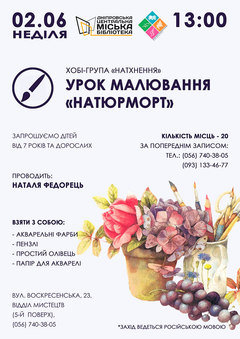 Днепровская Центральная городская библиотека, в рамках хобби-группы «Вдохновение» приглашает всех желающих на бесплатный урок рисования. Присутствующие будут учиться рисовать натюрморт.