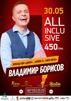 В этот четверг на вечеринке ALL INCLUSIVE с нами будет сам Владимир Борисов! Автор и актер команды КВН «Днепр», актер сериала «Країна У», «Лига смеха».