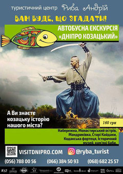 Во время автобусной экскурсии «Казацкий Днепр» вы увидите и узнаете: где находилась мощная Кодацкая крепость и которые героические события происходили там в XVII веке; как жили и чем занимались украинские рыцари-казаки; в какой части нашего города когда-то шумело море, что обороняют половецкие стражи ... и еще много интересного.