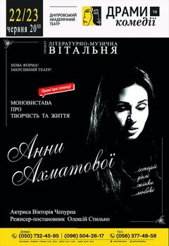 Наш театр продолжает удивлять премьерами. Предлагаем новый проект под названием "Литературно-музыкальная гостиная". Открытие которой состоится моноспектаклем о творчестве и жизни Анны Ахматовой.