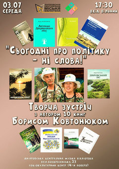 Приглашаем на творческую встречу "Сегодня о политике - ни слова!" с журналистом, краеведом и писателем Борисом КОВТОНЮК. Во время встречи состоится презентация свежей сборника стихов автора "Живоносный источник" (2019).