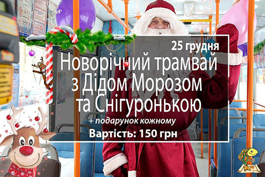 Встреча с Дедом Морозом и Снегурочкой. Интерактивная экскурсия по городу, экскурсовод в костюме Деда Мороза рассказывает о традициях празднования Нового Года и Рождества, начиная со старых времен, а также о традициях и обычаях празднования в Екатеринославе-Днепре. Гостей ждет сладкий подарок от Деда Мороза предновогодняя и новогодняя фотосессия по желанию. Трамвай украшен новогодними игрушками.