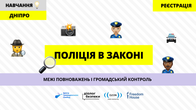 Тренинг по общественному контролю (Днепр) Сталкиваясь с полицией в реальной жизни, мы часто осознаем, насколько хватает нам понимание ее функций, границ полномочий. И самое главное не хватает знания инструментов, которые позволяют ее контролировать. Именно поэтому мы проводим обучение по общественному контролю за действиями полиции для всех заинтересованных темой. Мы расскажем о простых вещах, которые наделят вас суперсилой: замечать нарушения полицейских и знать как на них реагировать.