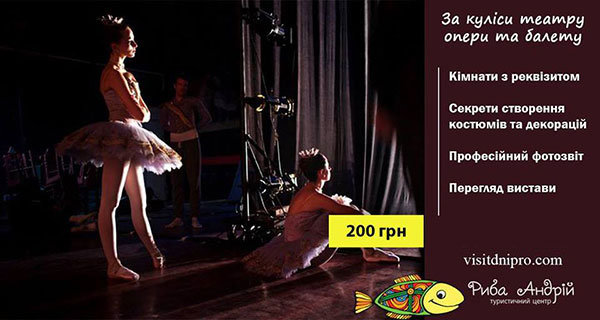 Говорят, что театр начинается с вешалки. Но на самом деле он начинается по ту сторону кулис - там, где рождаются представления. Мы предлагаем вам уникальную возможность заглянуть за кулисы Днепропетровского Академического Театра Оперы и Балета и увидеть то, чего обычно не видят зрители. В ходе экскурсии вы сможете заглянуть в комнату с реквизитом и узнать как гримеры превращают артистов на сказочных персонажей. Кроме того, вы узнаете, как создаются балетные костюмы и декорации для постановок, а также побываете на сцене театра, где воочию увидите последние приготовления перед спектаклем! По завершению экскурсии мы посетим представление.