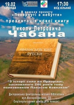 19 февраля в 17:30 в Днепровской Центральной городской библиотеке в рамках проекта "Возвращенные из небытия" состоится презентация новой книги Николая Петровича Чабана "Панасовский фрески"