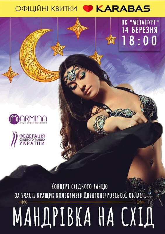 Засушливые пустыни, богатые караваны, звон монет, удары барабанов и танцы, танцы, танцы - всё это неотъемлемая часть волшебства, которое произойдет с нами! Во время путешествия нас будут сопровождать лучшие коллективы восточного и индийского танца Днепропетровской области: Нармина, Сангит, Sheikh Ali School и др.