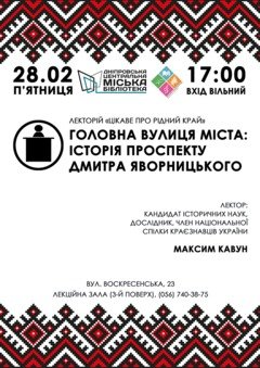 Днепровская Центральная городская библиотека приглашает всех желающих на лекцию от кандидата исторических наук, исследователя, члена Национального союза краеведов Украины - Максима Кавуна.