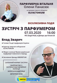 Творческая встреча с Председателем Гильдии Парфюмеров Украины, собирателем коллекции Музея Украинской парфюмерии послевоенного периода, куратором творческого объединения OLFACTORIUM – Владом Зварычем, по-новому откроет для вас мир парфюмерии.
