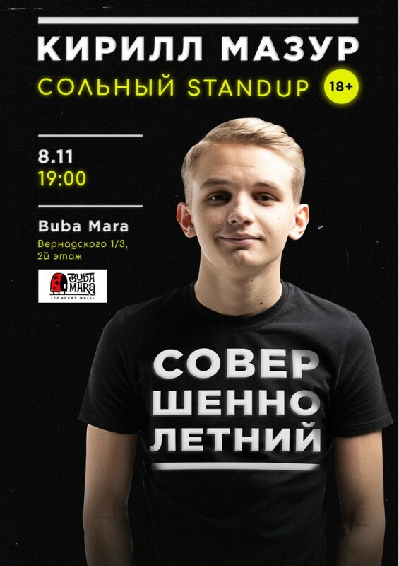 Сольный концерт Кирилла Мазура - это полуторачасовая программа, где собраны лучшие шутки и наблюдения комика! Выступление Кирилла для зрителя это как ностальгия по тем моментам в детстве, на которые он смотрит через призму юмора. В своих монологах шутит о взаимоотношениях мужчин и женщин, жизни с родителями и сложностях подростка в наше время. За 3 года занятия стендапом он уже стал одним из лучших комиков в Украине, трижды победителем "Рассмеши Комика" и резидентом проекта "Гуд Найт Клаб" на 1 1. Кирилл был хэдлйнером на различных муждународных стендап фестивалях и активно выступал на одной сцене с резидентами проекта "Stand Up" на ТНТ. Ждём вас, будет смешно!