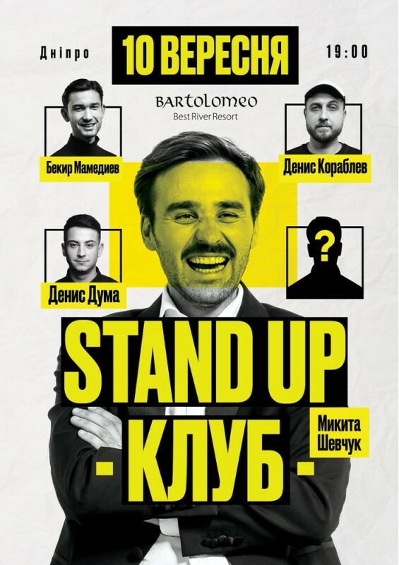 STAND UP КЛУБ – формат стендап-вечірок, на які не соромно запросити свою половинку, друзів, колег, шефа і навіть батьків. Особисті переживання коміків, смішні життєві ситуації та інтелігентне почуття гумору об'єднується в одному виступі.