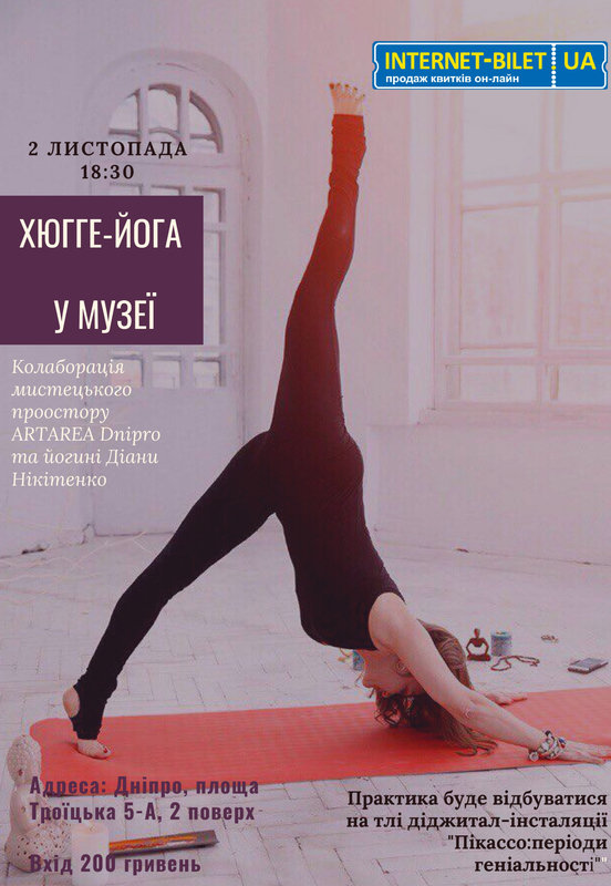 Вход - 200 грн ( в стоимость включены часовое занятие хюгге-йогой, просмотр двух диджитал-выставок, 25 эстампов Пабло Пикассо, эксплуатация ковриков для занятия).