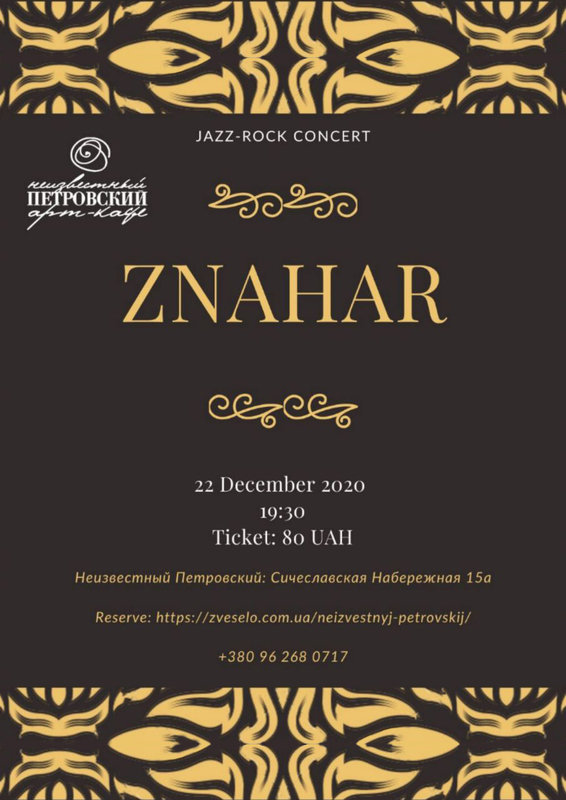 Акустический джаз-рок вечер! Уже 22-го декабря "Znahar" представят сет из авторских песен и будут создавать праздничную атмосферу. Открытый разговор с публикой о том, что нас ждёт в новом году. Ударные, гитара, вокал и твоё присутствие – всё, что нужно для того, чтобы вечер удался!