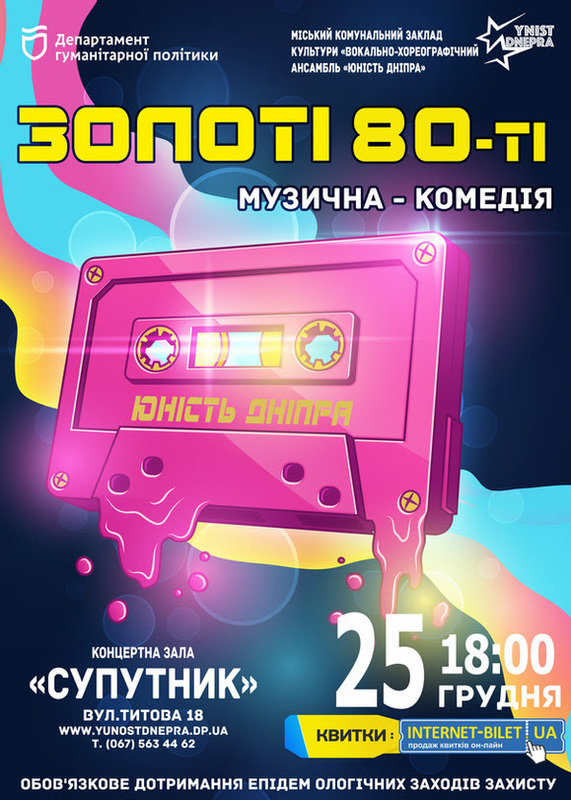 «Золотые 80-е» - это музыкальная комедия об исторической эпохе 80-х. Многие музыкальные хитов и юмора. Будет весело. Организатор проекта ансамбль «Юность Днепра». Режиссер проекта Обладатель художественных премий Денис Баскин