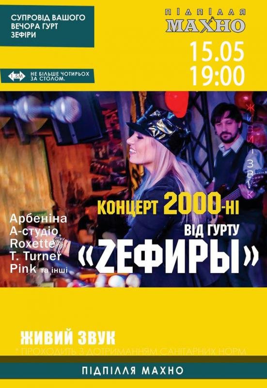 Уже полюбившаяся нашим гостям группа «Zефиры» из г. Запорожье приглашает всех на вечер 2000-х. Для вас будут играть взрывные хиты, душевные медленные композиции и просто песни, которые заставляют двигаться и подпевать!