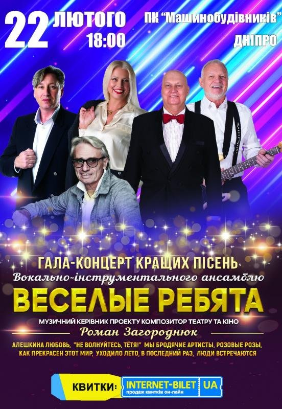 Сегодня в состав Вокально-инструментального ансамбля "Весёлые Ребята", под руководством композитора театра и кино, Романа Загороднюка, вошли исполнители звездных команд разных стран. Откровенный, харизматичный, талантливый коллектив дарит ощущение путешествия по миру и по времени. Невероятный концерт, незабываемые эмоции, отличное настроение для вас!