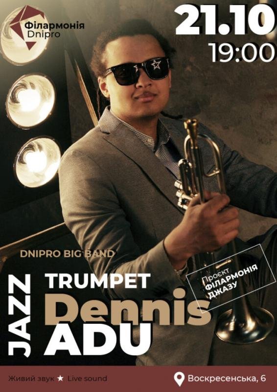 Денніс Аду — найвизнаніший і найулюбленіший публікою джазовий трубач України. Історія його успіху більше схожа на пригодницький роман, після прочитання якого вас ще довго переслідує спрага насолоди життям. Те саме відбувається, і коли слухаєш його музику. Отже! Цього осіннього вечора зі сцени звучатимуть сучасні біг бендові композиції та авторські аранжування.