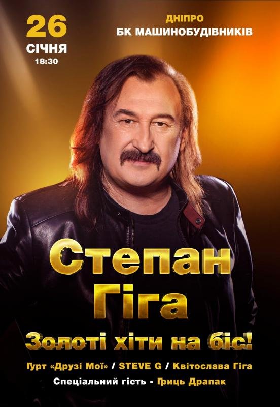Ви просили! Ми почули! Степан Гіга їде з концертом у Дніпро на біс! БК Машинобудівників. І це не сон! Доленосні хіти, які покорили не одне покоління! В цей день ніхто не буде скромно стояти під стінкою! Унікальна програма! Тільки найкращі! Золоті хіти!