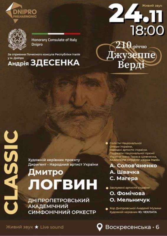 Концерт відбудеться за підтримки Почесного консула Республіки Італія у м. Дніпро Андрія Здесенка.