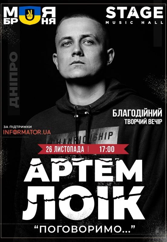 Благодійний творчий вечір Артема Лоіка. Заклик до спротиву, самоаналіз, пошук справжньої національної ідентичності та свідоме «повернення додому». Якщо ви хочете, щоб наша українська музика змінилася, підтримайте її вже зараз! «Кривавий тан», «Крила», «Не червона рута», «Сину 2», «Поговоримо?» - пісні, які слухають в тилу і на передовій. Більше, ніж реп! Провокаційніше, ніж поезія!