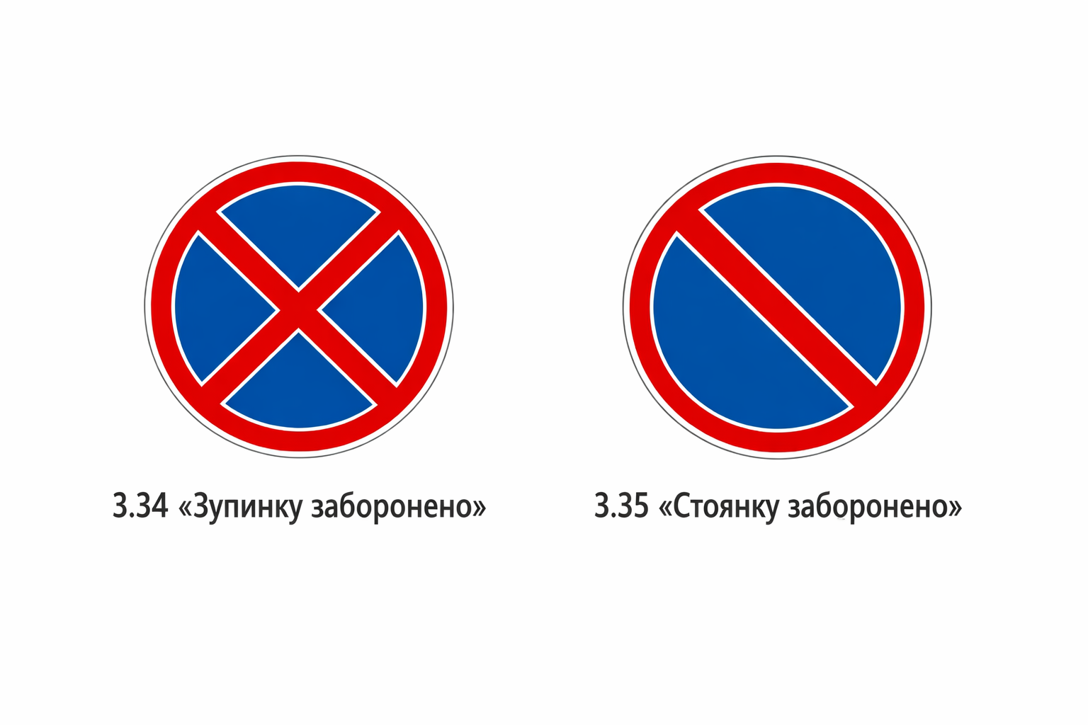 Різниця між 3.34 «Зупинку заборонено» та 3.35 «Стоянку заборонено»
