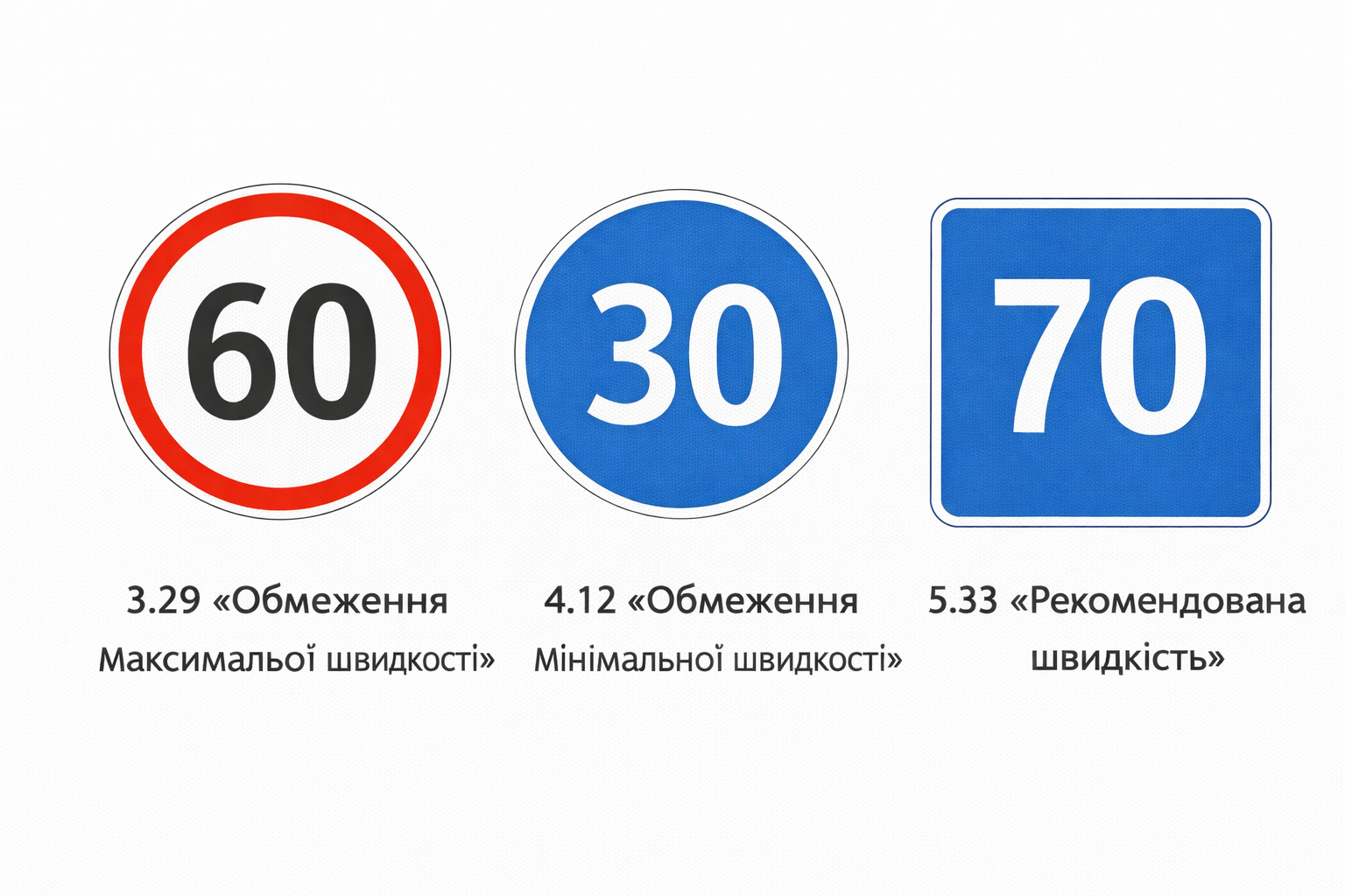 - 3.29 — обмежує максимальну швидкість. Кругла форма з червоною облямівкою підказує: це обмеження, яке не можна перевищувати.