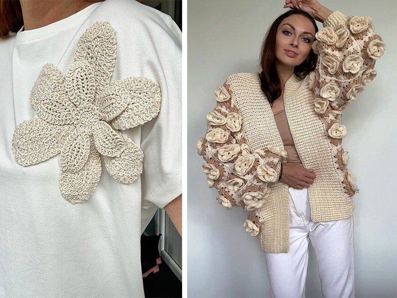 Це можуть бути гігантські троянди, розкидані по рукавах светра, або дрібні ромашки на літньому топі. Головне правило — об’єм має бути помітним. Якщо ви в’яжете «бабусин квадрат», спробуйте зробити його з об’ємною квіткою всередині. Це виглядає свіжо, грайливо і дуже жіночно.