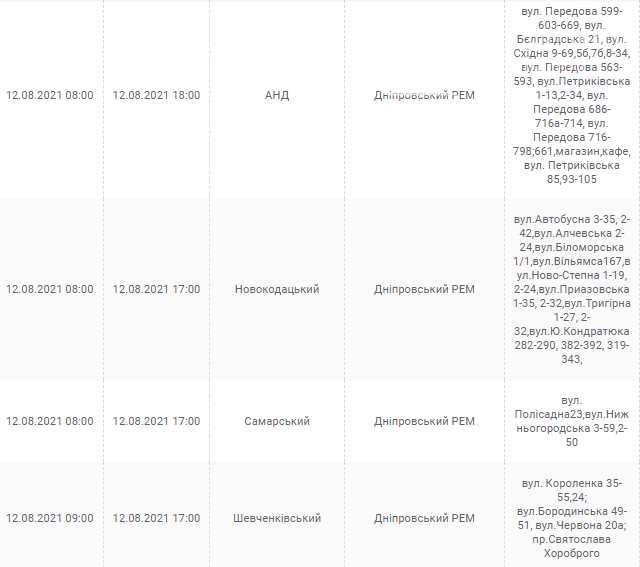 Днепр, 12 августа, график отключения электроэнергии: