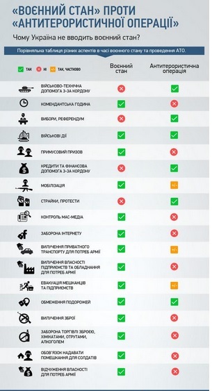 При военном положении также запрещаются забастовки и митинги. В то же время разрешается комендантское время, мобилизация, принудительный призыв, контроль над СМИ, запрет интернета, обязательное предоставление жилья для солдат, изымание частной собственности, автомобилей и оружия для нужд армии. При антитеррористической операции все эти пункты не вводятся в действие.
