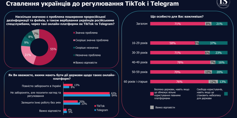 Більшість громадян України підтримують посилення державного нагляду та регулювання Telegram та TikTok. Про це свідчить дослідження Info Sapiens, передає Цензор.НЕТ. Дезінформація у соцмережах Так, 76% українців вважають, що поширення проросійської дезінформації через TikTok та Telegram є значною проблемою. Соціологи зазначають, що це свідчить про те, що платформи, за допомогою яких люди спілкуються та розважаються, можуть бути інструментом зовнішнього впл...