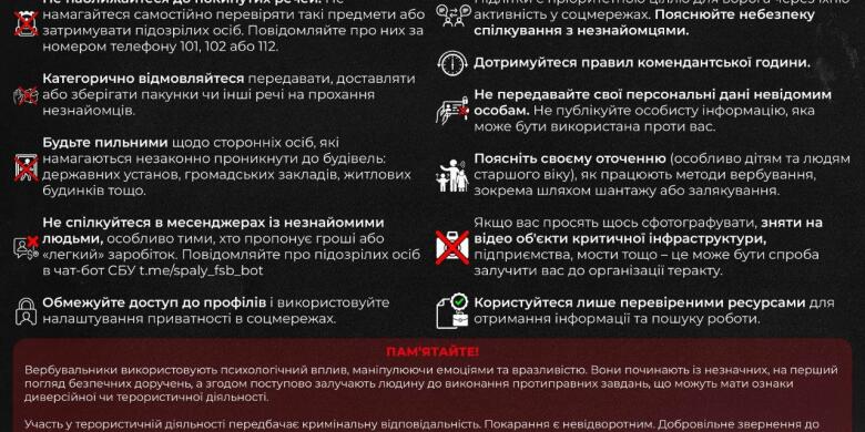 Центр протидії дезінформації спільно зі Службою безпеки України та Міністерством внутрішніх справ України розробили інструкцію для громадян щодо дій в умовах терористичної загрози. У ній пояснюється, як вчасно розпізнати небезпеку, уникнути ризиків та повідомити правоохоронців. У відомствах наголошують: співпраця з ворогом або передача інформації про важливі об’єкти є тяжким злочином проти національної безпеки. Зокрема, громадян застерігають від фото- чи в...