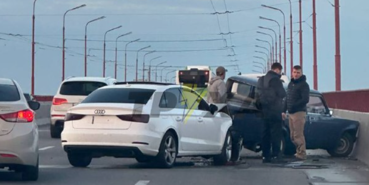 На Новому мосту сталася серйозна ДТП. На початку мосту, в бік лівого берега зіштовхнулись дві автівки. ВАЗ сильно зім'яло: Audi на швидкості приплющила його до огорожі. Аварія зайняла дві смуги руху. Утворився величезний затор. На місці аварії на Новому мосту працюють поліція, медики та рятувальники. "Рух дуже ускладнено. Плануйте свій час. Будьте обережні за кермом!", - йдеться в повідомленні Ситуаційного центру Дніпра.