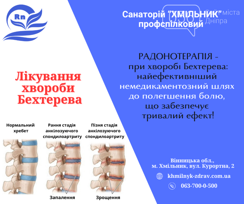 Лікування хвороби Бехтерева у Хмільнику — це ефективна санаторно-курортна реабілітація при анкілозивному спондилоартриті з використанням унікальних природних ресурсів та сучасних методик.